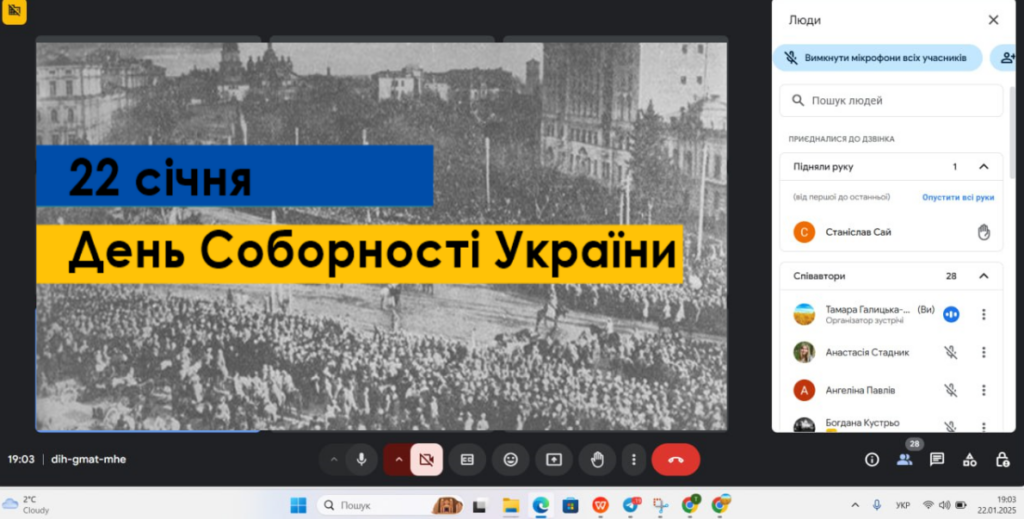 22 січня 2025 р. заступниця декана Факультету історії, політології і міжнародних відносин, доцент кафедри історії України і методики викладання історії Тамара Галицька-Дідух провела виховний захід, присвячений Дню Соборності України. Це свято нагадує про дві визначальні події в історії Читати далі