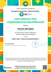 Доцент кафедри історії України і методики викладання історії Богдан Паска успішно завершив програму підвищення кваліфікації «Квест-курс “Освіта без дискримінації”», організовану громадською організацією «ЕдКемп Україна». Навчання було спрямоване на опанування сучасних підходів до формування інклюзивного та безпечного освітнього середовища, а також на поглиблення розуміння особливостей підтримки дітей з особливими освітніми потребами.