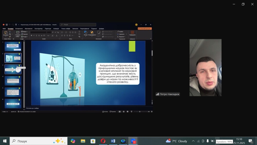 Тетяна Гоцанюк у своєму виступі підкреслила роль наукового керівника як наставника який формує культуру академічної етики, навчає критично оцінювати інформацію, дотримуватися вимог цитування та уникати будь-яких проявів недоброчесності. Таке партнерство, за словами доповідачки, сприяє формуванню покоління молодих учених, здатних розвивати науковий простір на засадах прозорості, доброчесності та європейських стандартів академічної культури. Назарій Пінчук порушив питання формування культури академічної доброчесності як складової професійного іміджу майбутнього менеджера освіти. Петро Накладюк представив результати дослідження щодо академічної доброчесності у природничих науках. Роман Кондрат окреслив виклики та стратегії забезпечення академічної доброчесності в умовах цифрової підготовки майбутніх гірничих інженерів. Іван Гайнюк висвітлив можливості та ризики використання штучного інтелекту у STEM-освіті для майбутніх учителів. Валентин Магас акцентував увагу на етичних ризиках цифрових технологій під час підготовки ІТ-фахівців.
