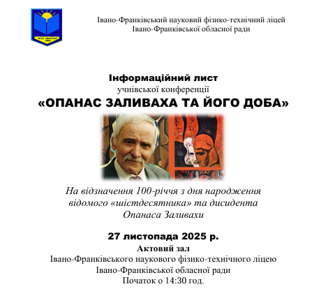 27 листопада 2025 р. доцент кафедри історії України і методики викладання історії Богдан Паска взяв участь у науковій учнівській конференції «Опанас Заливаха та його доба», організованій Івано-Франківським науковим фізико-технічним ліцеєм. Захід був присвячений 100-річчю від дня народження видатного художника-шістдесятника та дисидента Опанаса Заливахи – однієї з ключових постатей українського культурного спротиву другої половини ХХ ст.