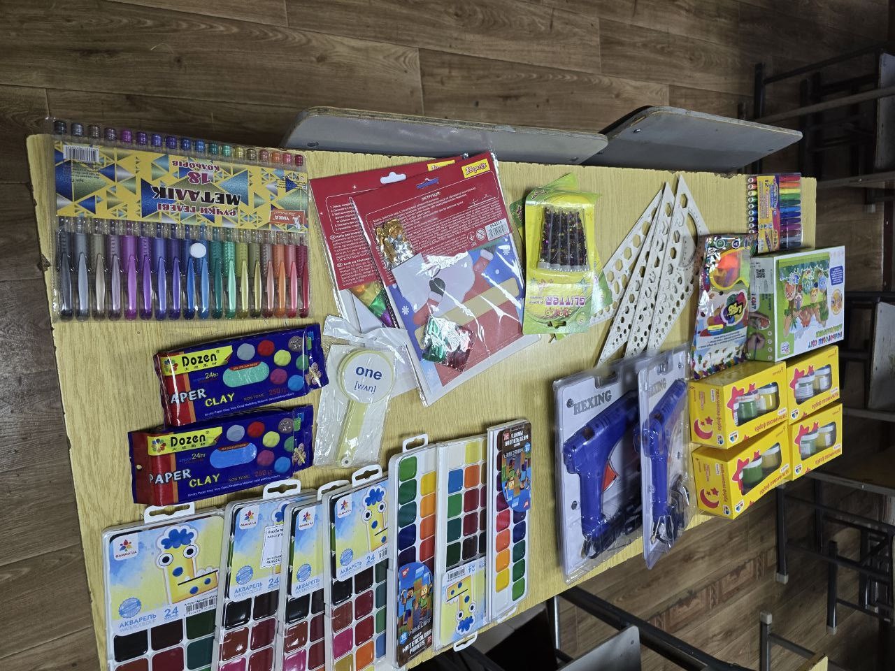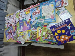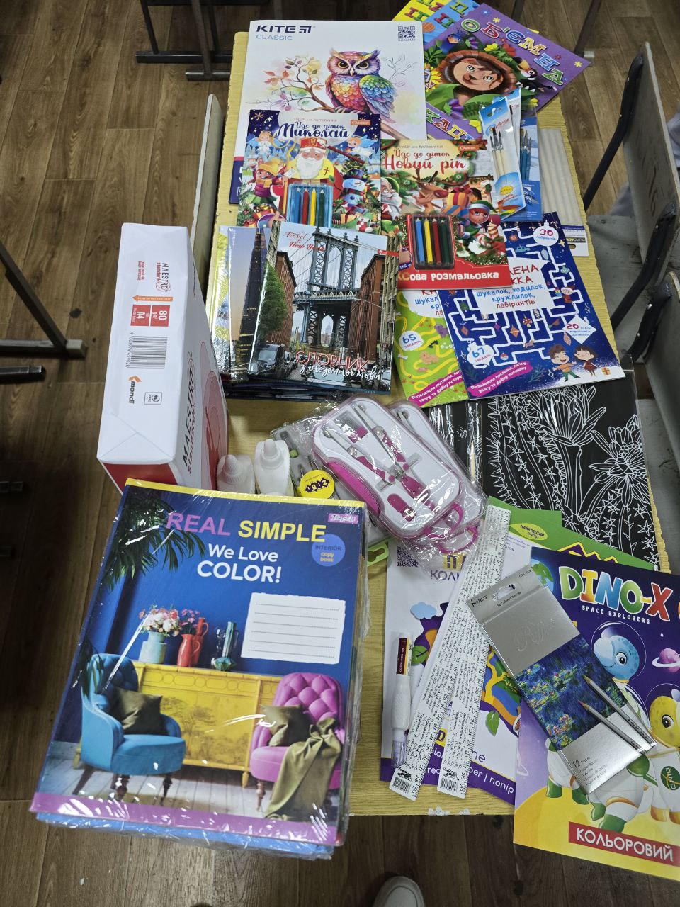 Для навчання і творчості діти отримали зошити, альбоми для малювання, мольберт, фарби, пензлі, картон, клей, клейовий пістолет, книги, розмальовки, саморобки, прописи, пластилін, пасту для моделювання, творчі набори та пірамідки.