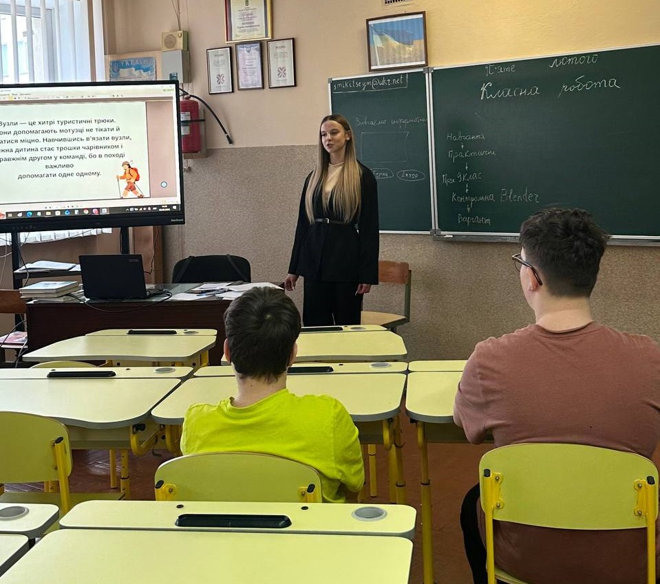 Під час заняття вихованці гуртка за допомогою презентації мали змогу ознайомитися з різними видами вузлів, розглянути схеми їх в’язання та призначення. Після перегляду студентки-практикантки роздали учням аркуші, на яких вони записували всі вузли, що запам’ятали, а також ставили позначку «+» біля тих, які вже вміють в’язати.