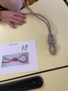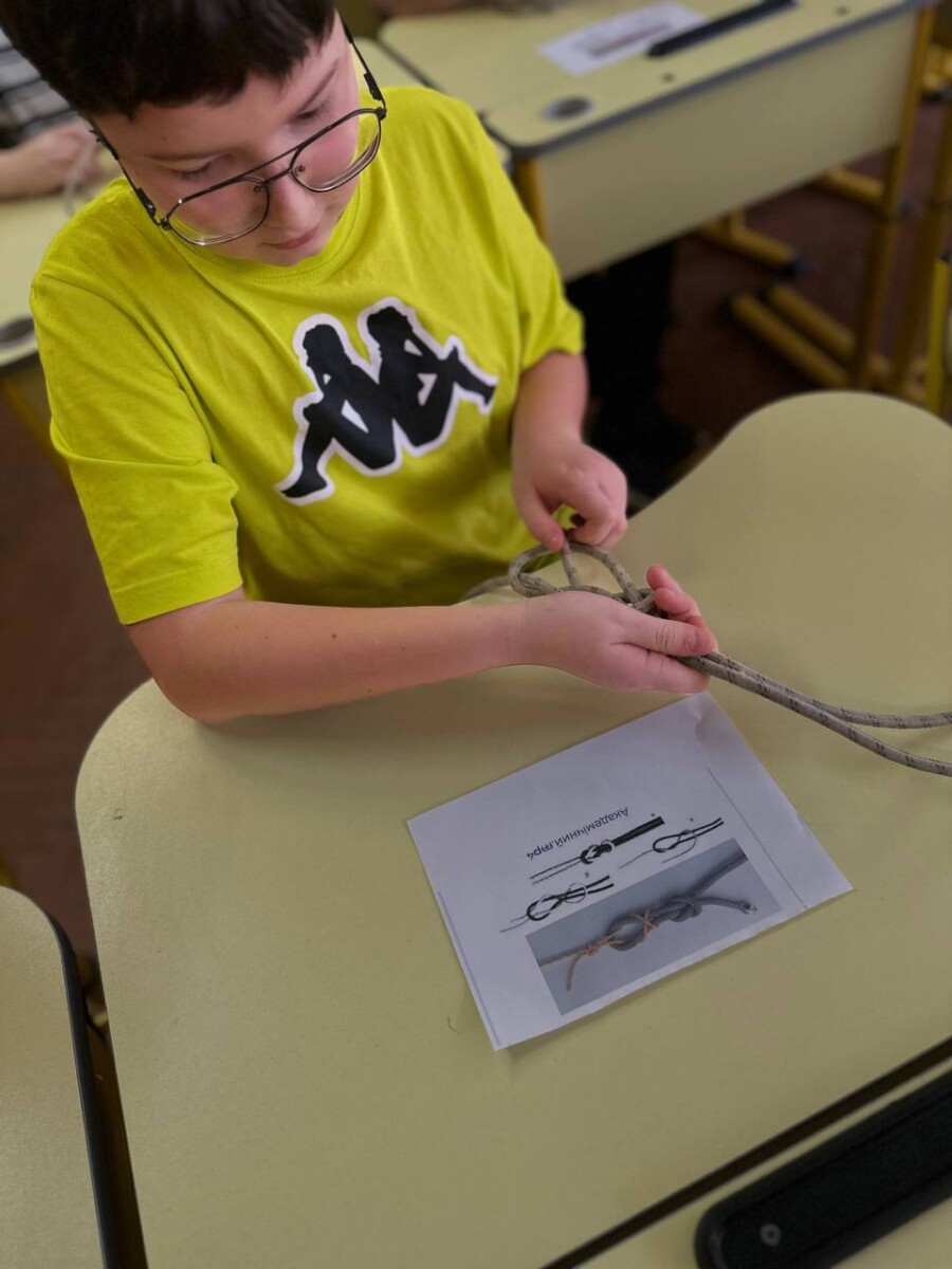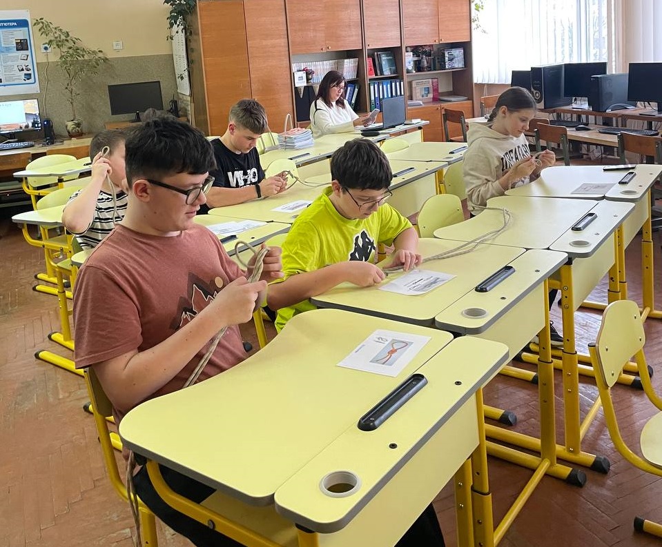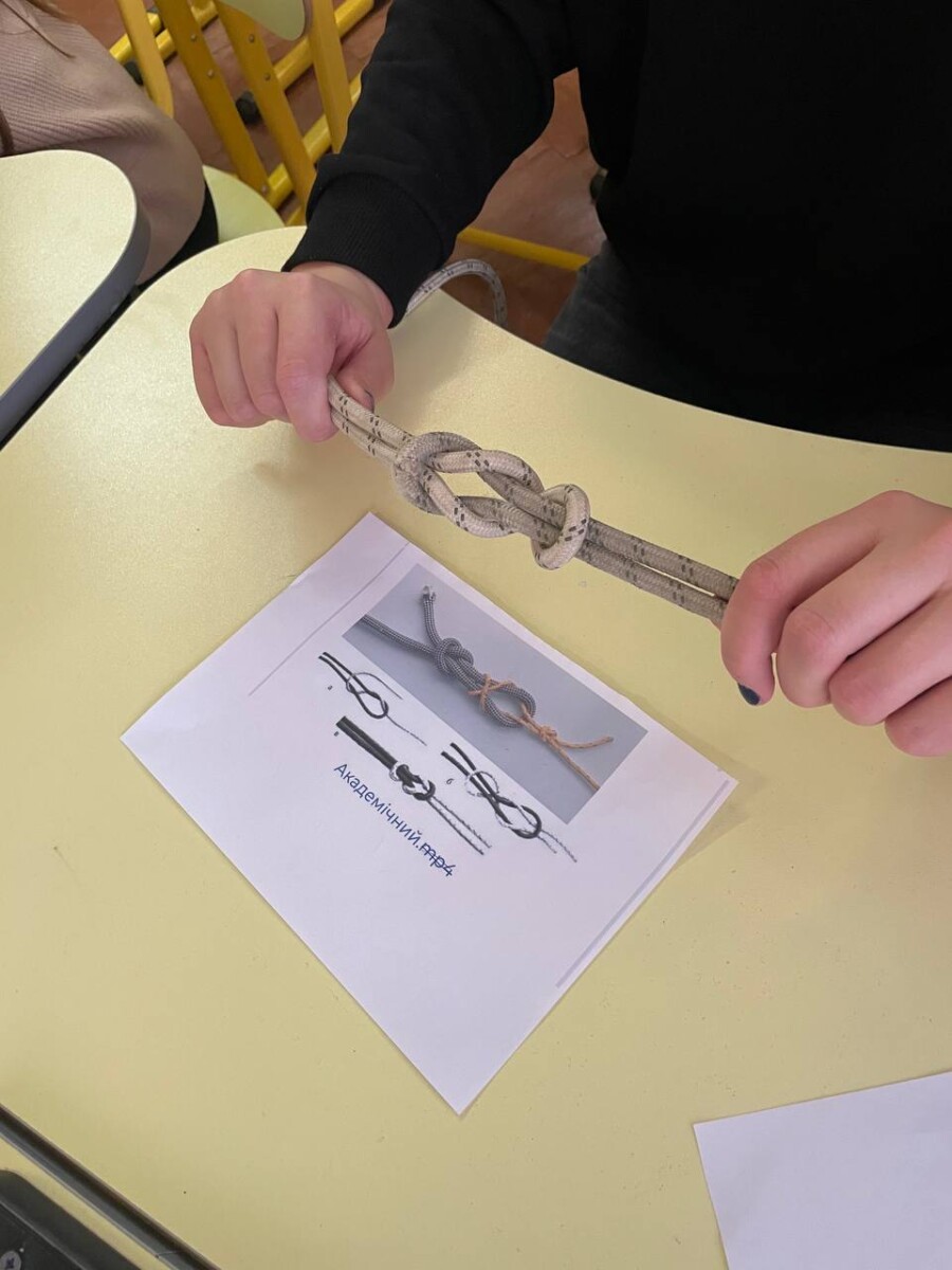Після теоретичного опрацювання матеріалу вихованцям гуртка надали можливість практично спробувати в’язати вузли за роздрукованими схемами. Це сприяло кращому засвоєнню знань та дало змогу кожному проявити себе. Здобувачі освіти з зацікавленням виконували завдання, зокрема в’язали вузли на швидкість.