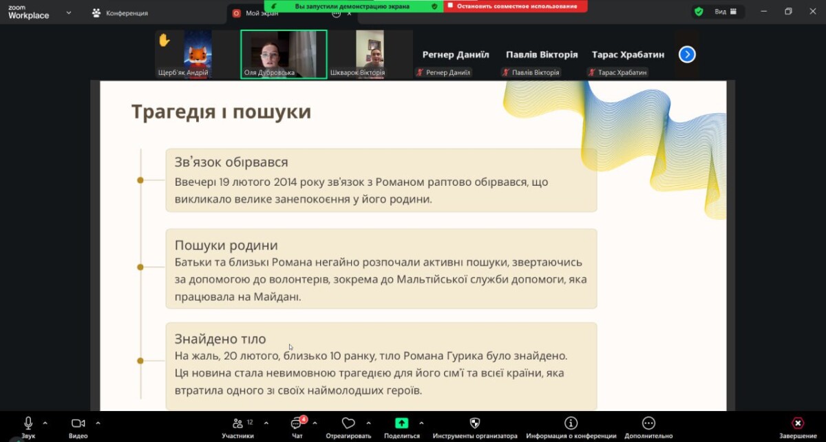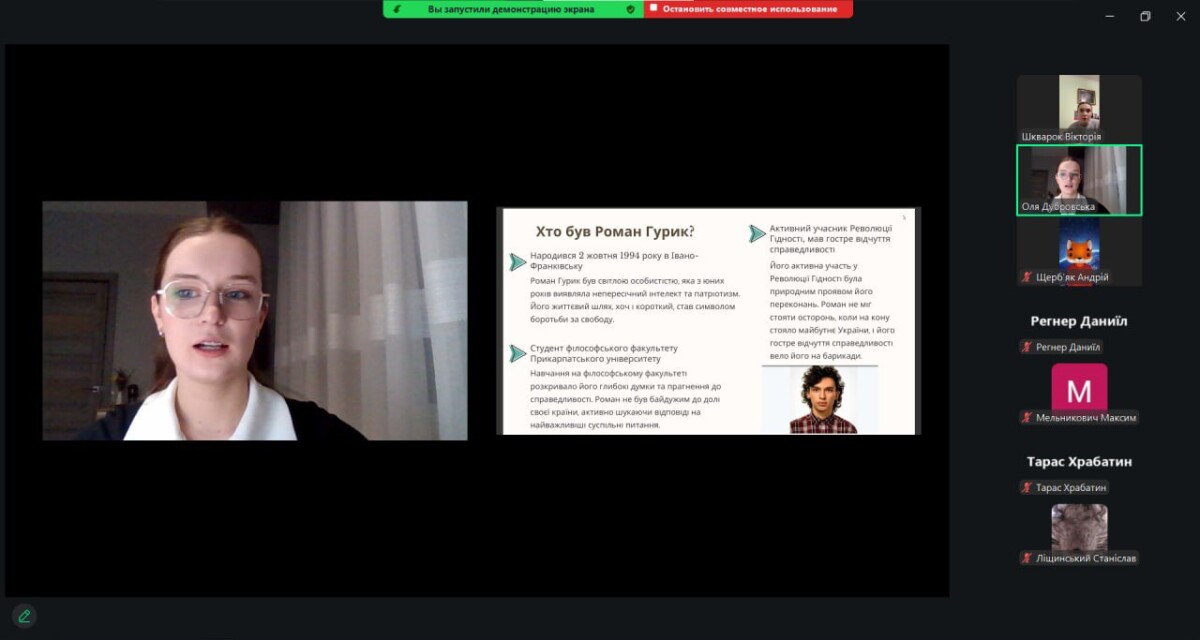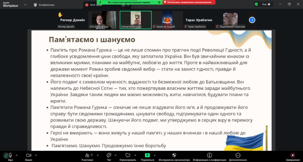 Під час заходу основний акцент було зроблено саме на постаті Романа Гурика – його життєвих цінностях, світогляді, активній громадянській позиції та готовності відстоювати гідність і свободу своєї держави. Учасники ознайомилися з біографічними відомостями, переглянули презентацію та фотоматеріали, дізналися більше про його навчання, мрії та прагнення. Через ці факти поступово розкривався образ звичайного юнака, який став символом мужності та самопожертви.