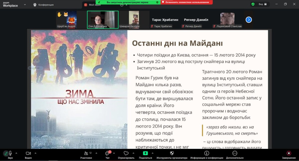 Події Революції Гідності були висвітлені стисло – як історичне тло, на якому проявився героїзм Романа. Головною метою зустрічі було не детальне вивчення причин і наслідків революції, а глибше розуміння значення особистого вибору та відповідальності перед своєю країною.