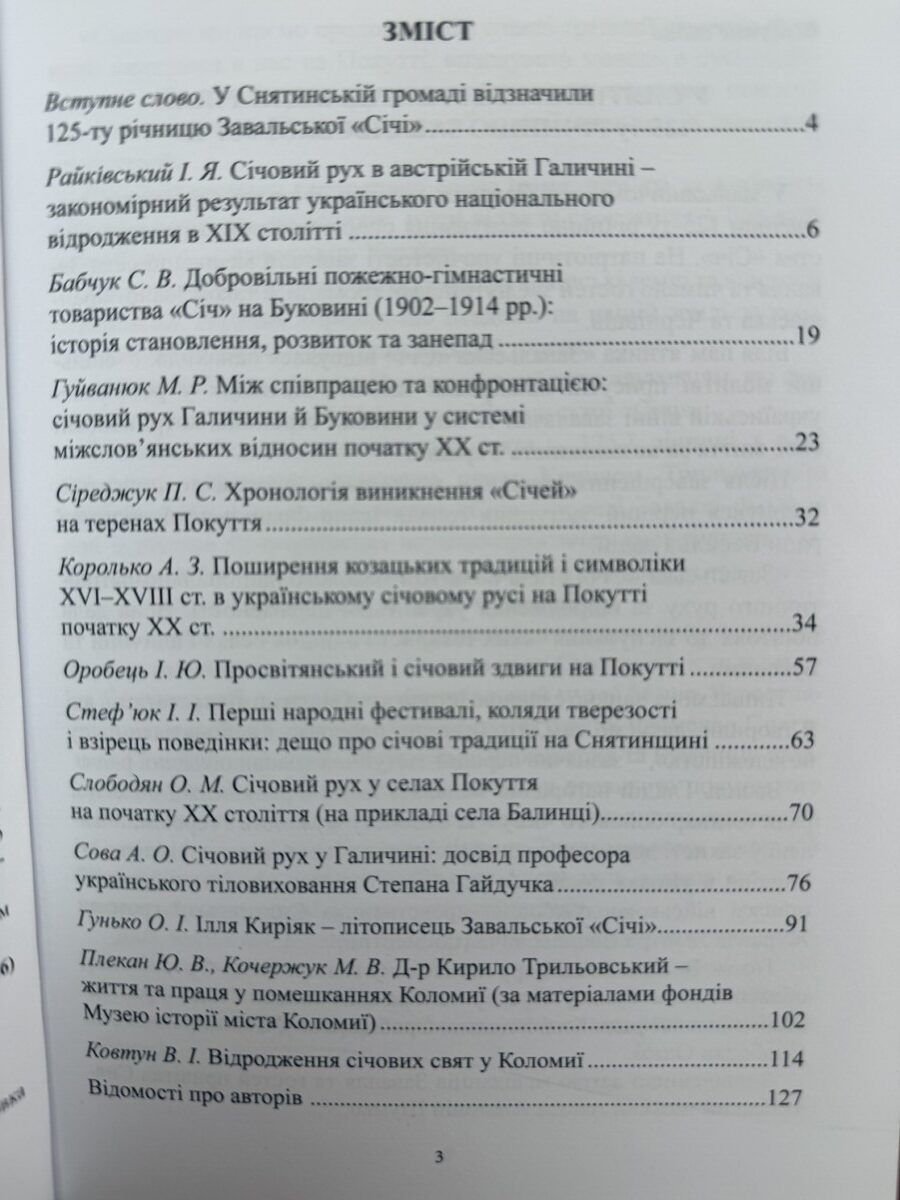 У збірнику представлено статті доктора історичних наук, професора, завідувача кафедри історії України і методики викладання історії Ігоря Ярославовича Райківського «Січовий рух в австрійській Галичині – закономірний результат українського національного відродження в ХІХ столітті» та кандидата історичних наук, доцента Андрій Зіновійовича Королька «Поширення козацьких традицій і символіки ХVI–XVIII ст. в українському січовому русі на Покутті початку ХХ ст.». Сподіваємося, що видання, адресоване науковцям, краєзнавцям, дослідникам-любителям, студентам та учням, зацікавить усіх, хто виявляє інтерес до минулого рідного краю.